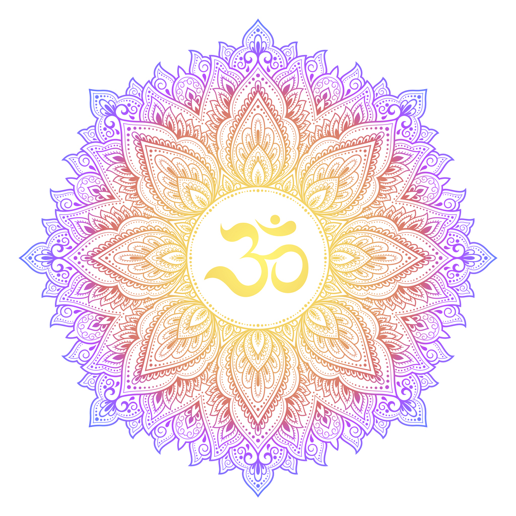Color Circular pattern in form of mandala with ancient Hindu mantra OM and lotus flower for Henna, Mehndi, decoration. Decorative ornament in oriental style. Rainbow design on white background.